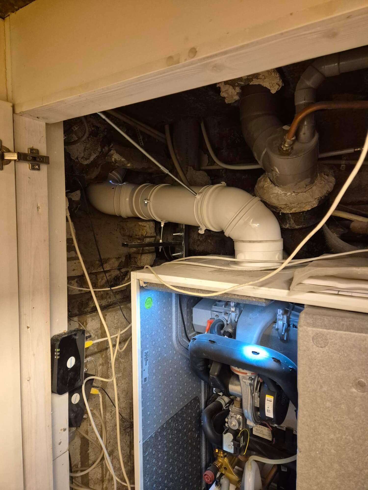 Vervangen rookgasafvoer- en luchttoevoersysteem van de c.v -ketel in de kelder bij een woonhuis in Bussum.